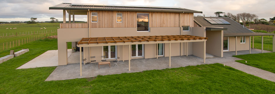 The positioning of buildings allows for a visual connection between garaging and the main house. The positioning of the garages also provides shelter from the prominent westerly winds, to both the outdoor working areas & family spaces.